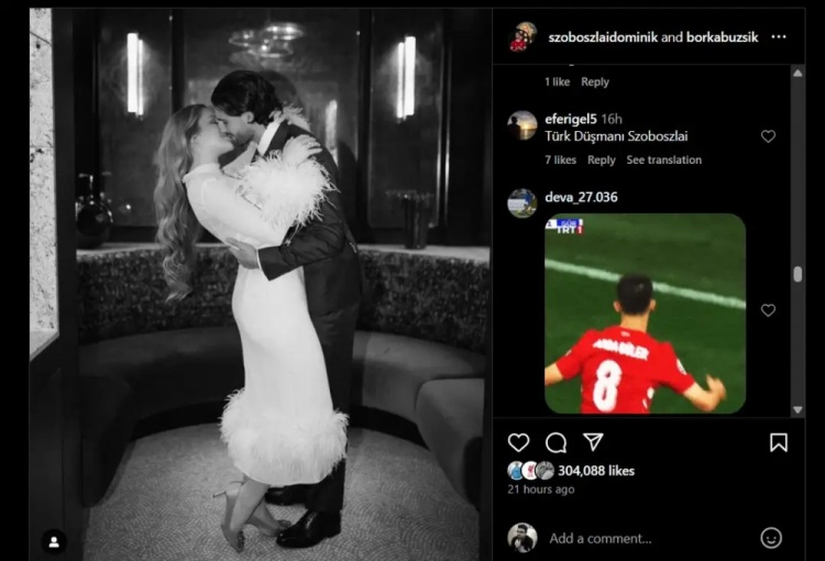 现在这种行为还未结束,索博昨天晒出自己的结婚照,评论区仍然有很多球迷在刷居勒尔的照片,不少支持索博的球迷则表示:“土耳其爱哭鬼又来了。”