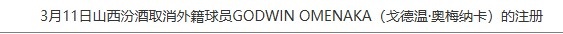 2025-03-11 21:26:41山西男篮取消戈德温-奥梅纳卡的注册 并为凯西-普拉瑟完成注册