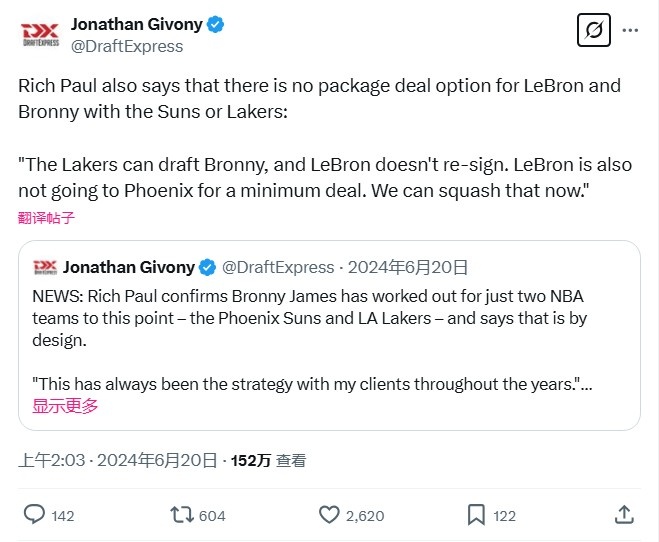 到了2024年6月20日选秀大会前夕,詹姆斯父子的经纪人里奇-保罗在接受ESPN采访时透露,布朗尼只为湖人和太阳两支球队试训过。