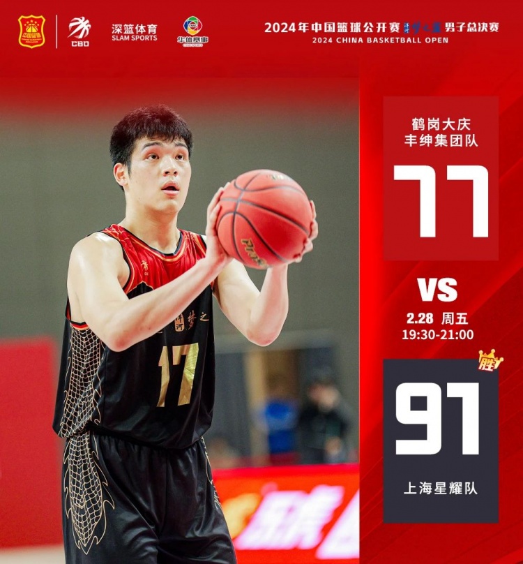 上半场,两队打得相对胶着。上海星耀17号陆峰几次关键性投篮,帮助球队取得领先。20号卜令轩外线出手命中多个三分,半场结束,上海星耀48-39领先大庆丰绅集团。下半场,大庆丰绅集团加强防守和对篮板球的拼抢,在第三节追至64-66。关键的第四节,24号刘畅率队开始进攻,最终上海星耀91-77战胜大庆丰绅集团。