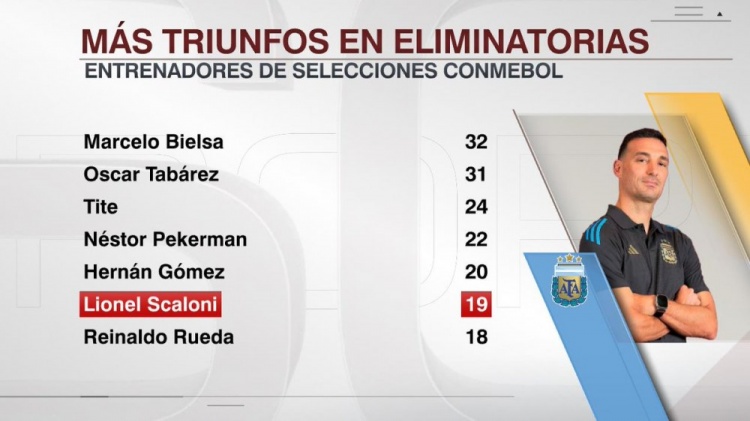 2025-03-22 11:15:45斯卡洛尼执教阿根廷世预赛取胜19场,南美国家队主帅第6多
