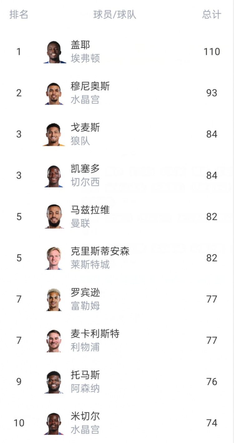 2025-04-01 12:10:27110次!埃弗顿中场盖耶是本赛季英超唯一抢断次数超100的球员