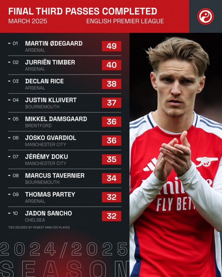 2025-04-01 12:12:19英超3月进攻三区成功传球排名:厄德高49次居首,阿森纳包揽前三