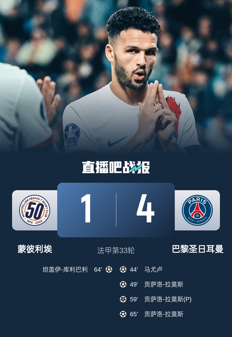法甲第33轮,巴黎4-1蒙彼利埃取得近四轮首胜。上半场,特纳斯献神扑,巴尔科拉爆射中楣,马尤卢抽射打破僵局;下半场,拉莫斯完成帽子戏法