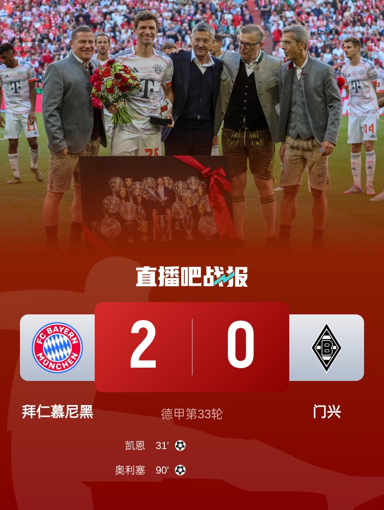 穆勒主场谢幕战!拜仁2-0门兴 凯恩破门奥利塞传射 穆勒收获列队